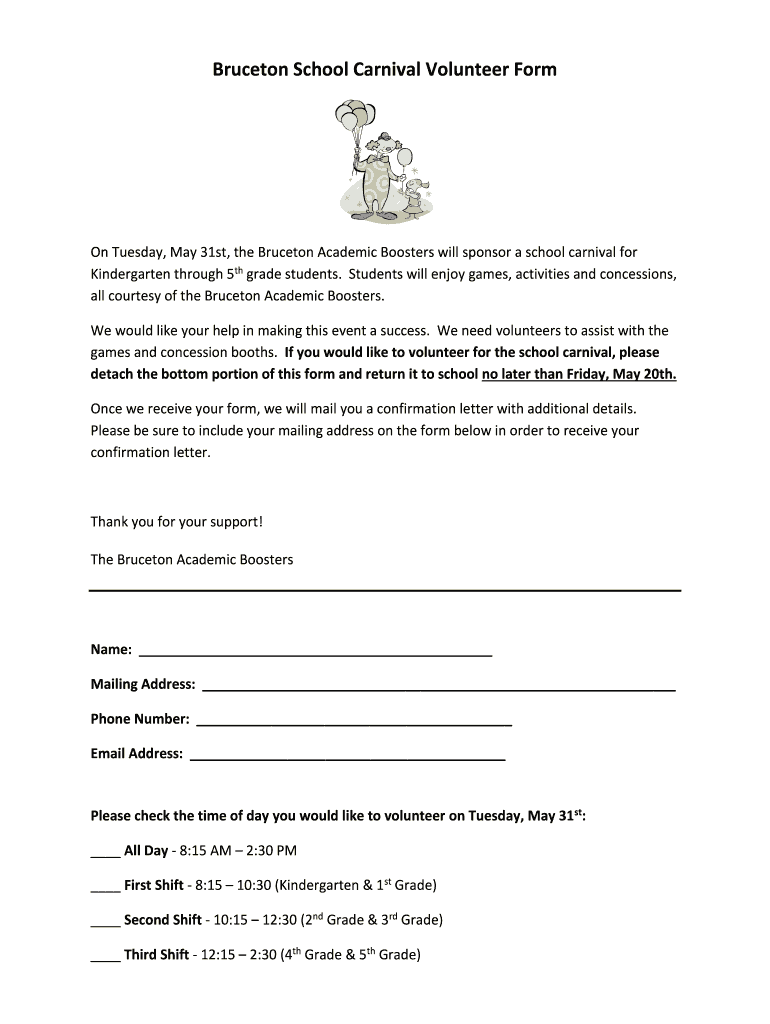 Information that must be reported on bruceton school carnival volunteer includes personal details, contact information, availability, skills or preferences, and any relevant experience.
