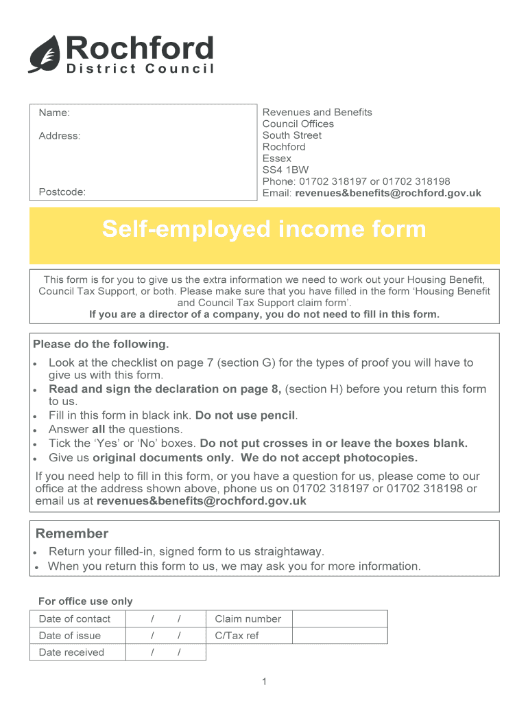 Revenues and Benefits Council Offices South Street Rochford Essex SS4 1BW Phone: 01702 318197 or 01702 318198 Email: revenues&benefits Rochford.gov.name: Address:Postcode:Self employed income from
