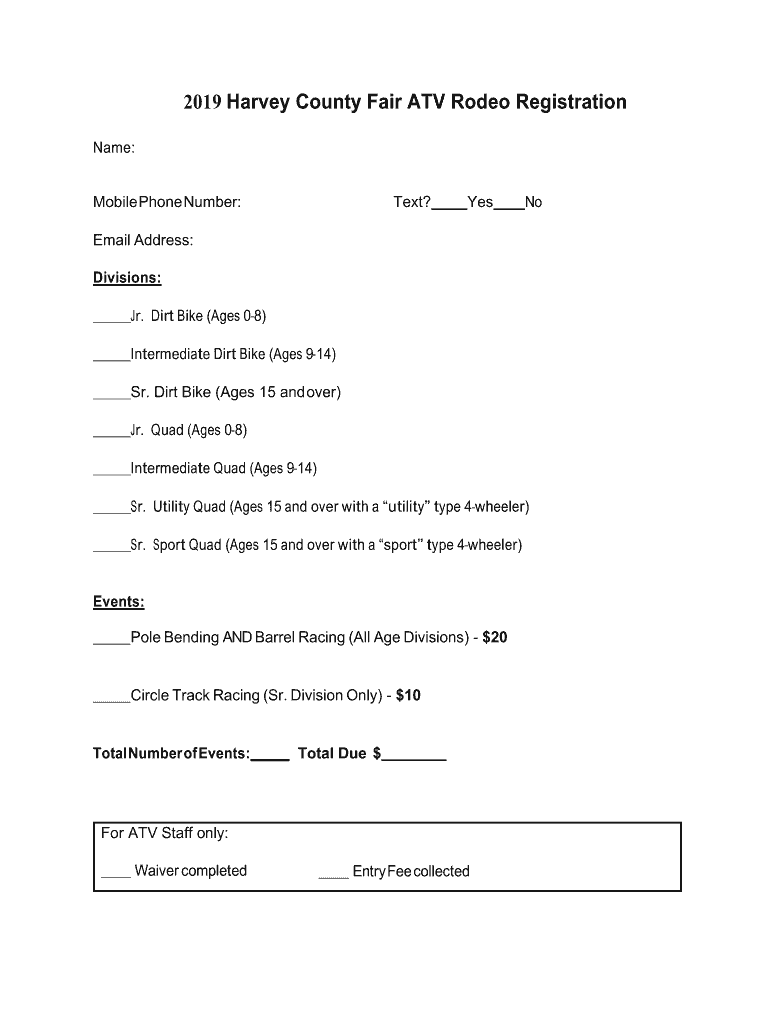 2019 Harvey County Fair ATV Rodeo Registration Name: Mobile Phone Number:Text? YesNoEmail Address: Divisions: Jr. Dirt Bike (Ages 0 8) Intermediate Dirt Bike (Ages 9 14) Sr. Dirt Bike (Ages 15 and