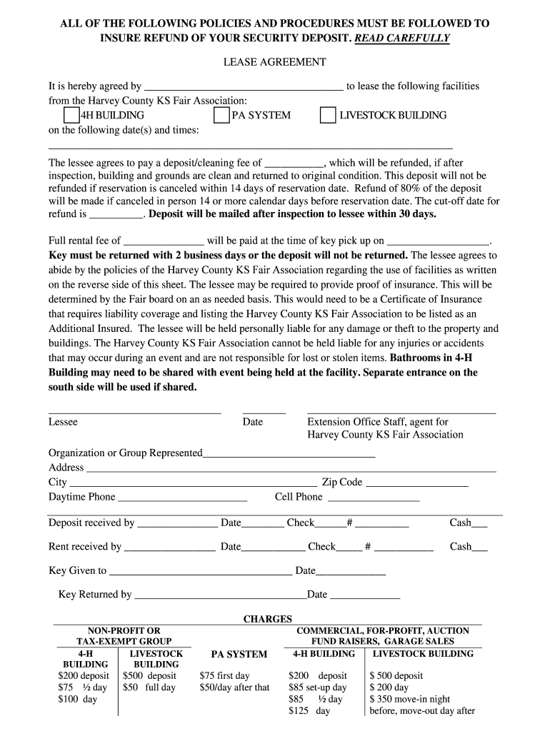 POLICIES FOR RENTAL OF 4H BUILDING & LIVESTOCK BUILDING on the HARVEY COUNTY FAIRGROUNDS All transactions for deposits, rental payments, refunds, cancellations etc. must be made in person at the Harvey