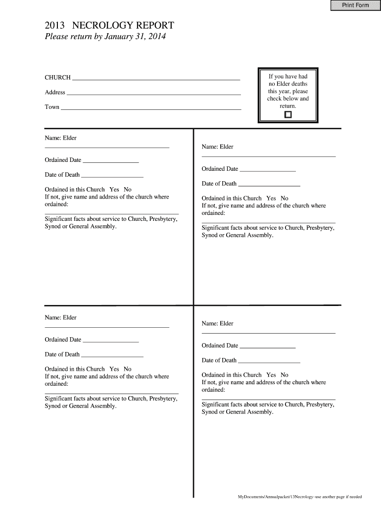 The Necrology Report serves as a crucial document for churches to report elder deaths within their congregation. It plays a significant role in capturing details such as the elder's name, ordination date, date of death, and notable service facts. Completing this report by the deadline, January 31, 2014, ensures that the contributions of deceased elders are formally acknowledged.