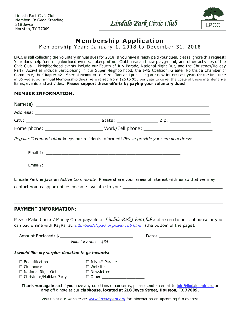 Lin dale Park Civic Club Member “In Good Standing 218 Joyce Houston, TX 77009Lindale Park Civic ClubLPCCMembership Application Membership Year: January 1, 2018, to December 31, 2018, PCC is still