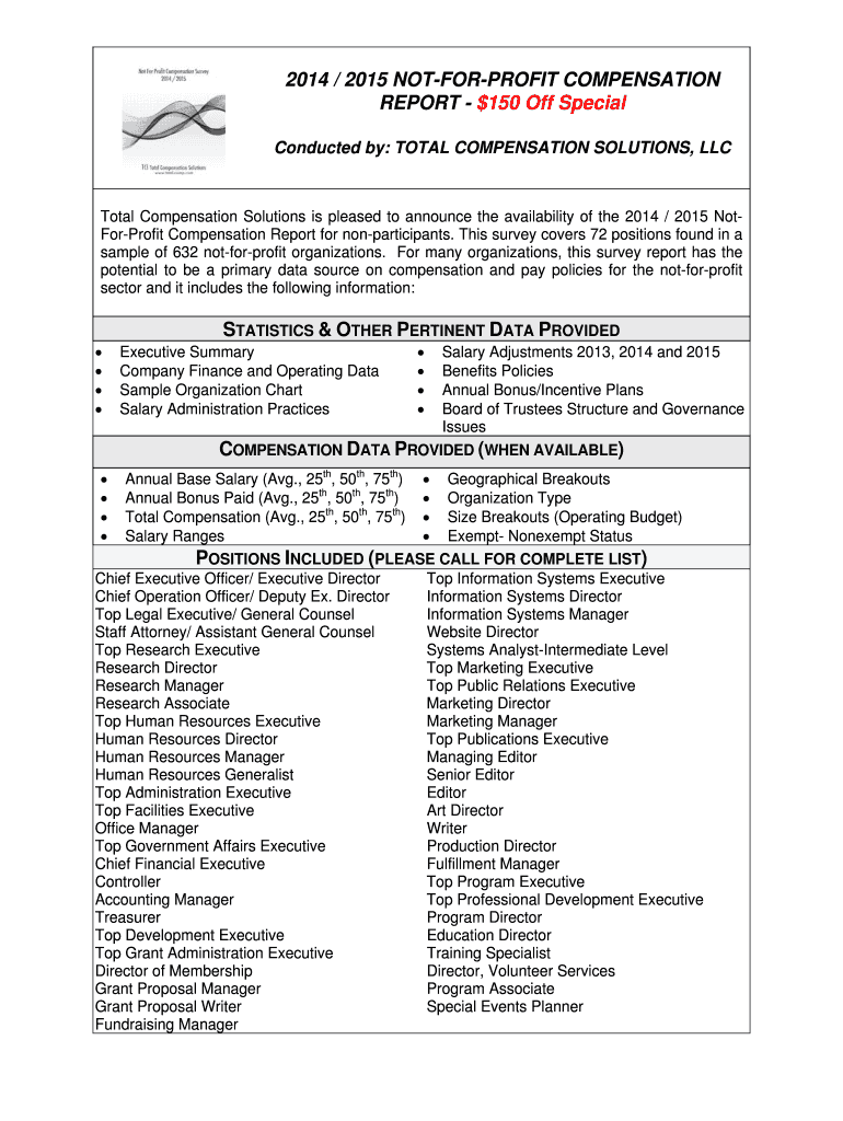 2014 / 2015 NOTFORPROFIT COMPENSATION REPORT $150 Off Special Conducted by: TOTAL COMPENSATION SOLUTIONS, Total Compensation Solutions is pleased to announce the availability of the 2014 / 2015 NotForProfit