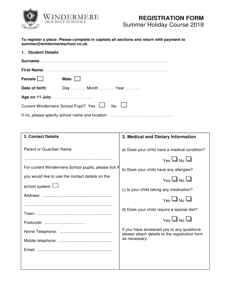 REGISTRATION FORM Summer Holiday Course 2018 To register a place: Please complete in capitals all sections and return with payment to summer windermereschool.co.UK.1. Student Details Surname:. First