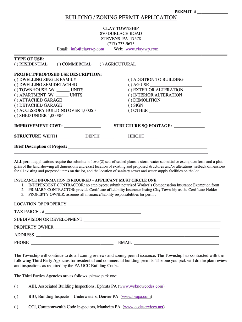 PERMIT # BUILDING / ZONING PERMIT APPLICATION CLAY TOWNSHIP 870 REACH ROAD STEVENS PA 17578 (717) 7339675 Email: info claytwp.com Web: www.claytwp.com TYPE OF USE: () RESIDENTIAL () COMMERCIAL ()