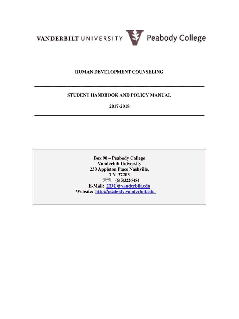 HUMAN DEVELOPMENT COUNSELINGSTUDENT HANDBOOK AND POLICY MANUAL 20172018Box 90 Peabody College Vanderbilt University 230 Appleton Place Nashville, TN 37203 (615)3228484 Email: HD Vanderbilt.edu Website: