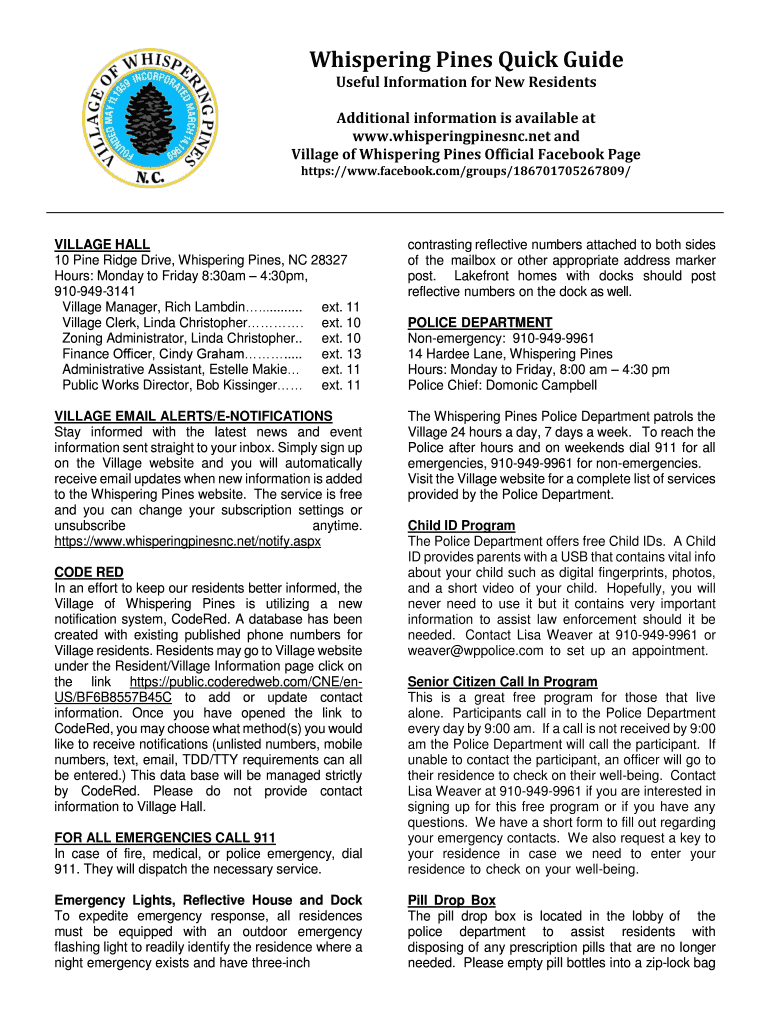 Whispering Pines Quick Guide Useful Information for New ResidentsAdditional information is available at www.whisperingpinesnc.net and Village of Whispering Pines Official Facebook Page https://www.facebook.com/groups/186701705267809/VILLAGE