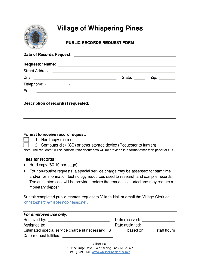 Village of Whispering Pines PUBLIC RECORDS REQUEST FORM Date of Records Request: Requestor Name: Street Address: City: State: Zip: Telephone: () Email: Description of record(s) requested: Format to