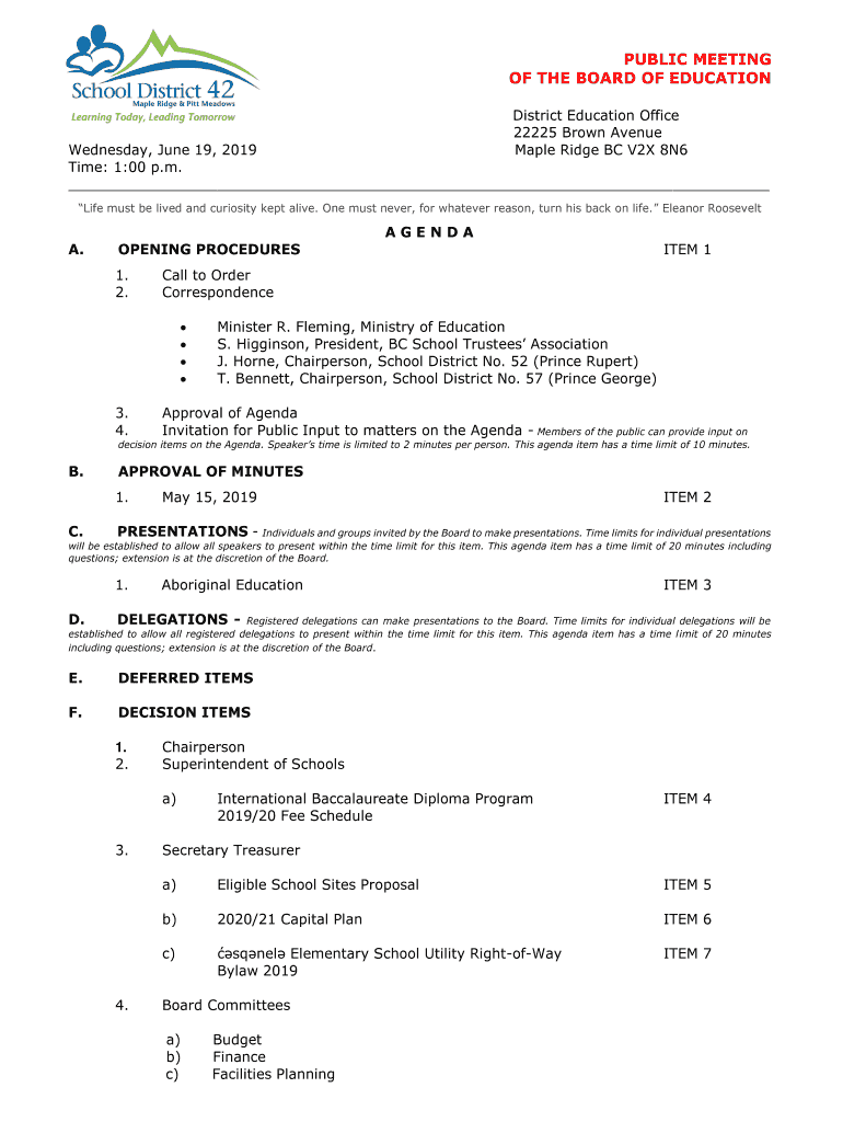 PUBLIC MEETING OF THE BOARD OF EDUCATION District Education Office 22225 Brown Avenue Maple Ridge BC V2X 8N6Wednesday, June 19, 2019, Time: 1:00 p.m. Life must be lived and curiosity kept alive. One