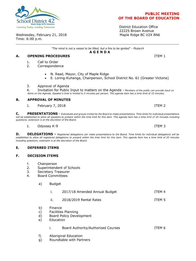 PUBLIC MEETING OF THE BOARD OF EDUCATION District Education Office 22225 Brown Avenue Maple Ridge BC V2X 8N6Wednesday, February 21, 2018, Time: 6:00 p.m. The mind is not a vessel to be filled, but