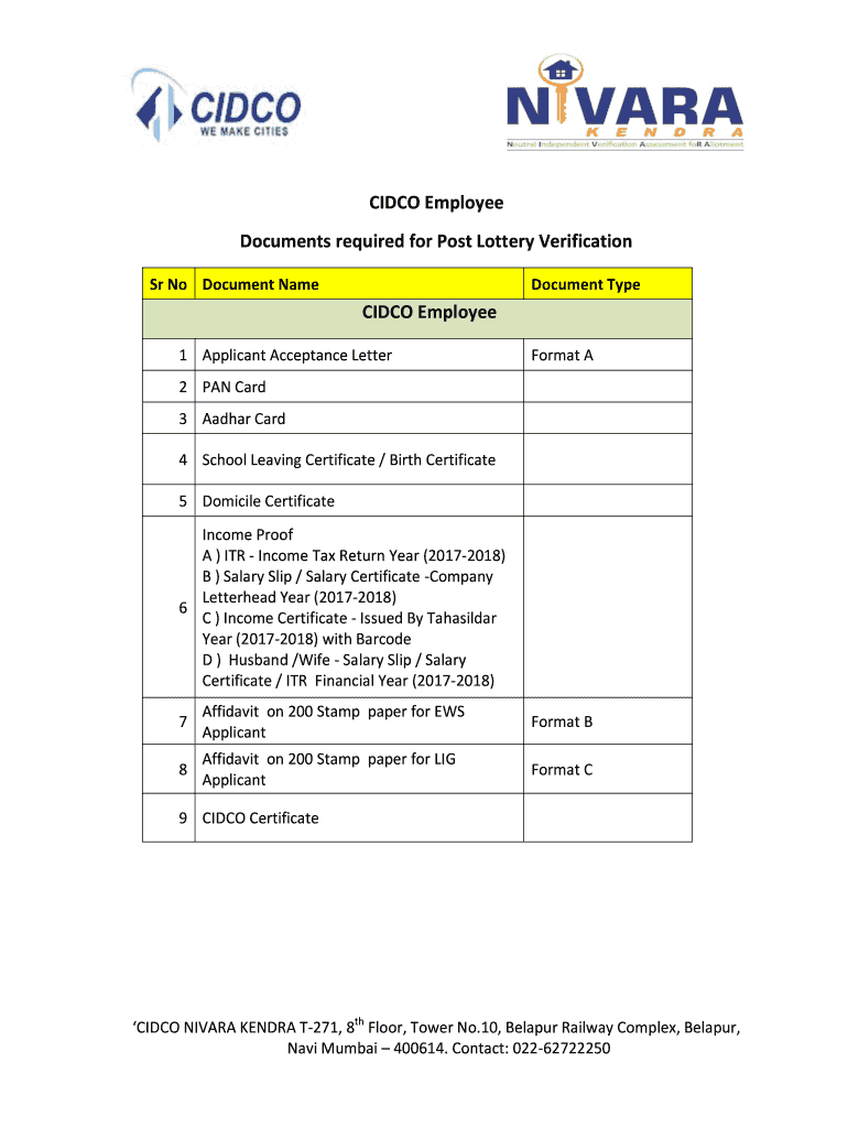 CISCO Employee Documents required for Post Lottery Verification Sr No Document NameDocument TypeCIDCO Employee 1 Applicant Acceptance LetterFormat A2 PAN Card 3 Aadhaar Card 4 School Leaving Certificate