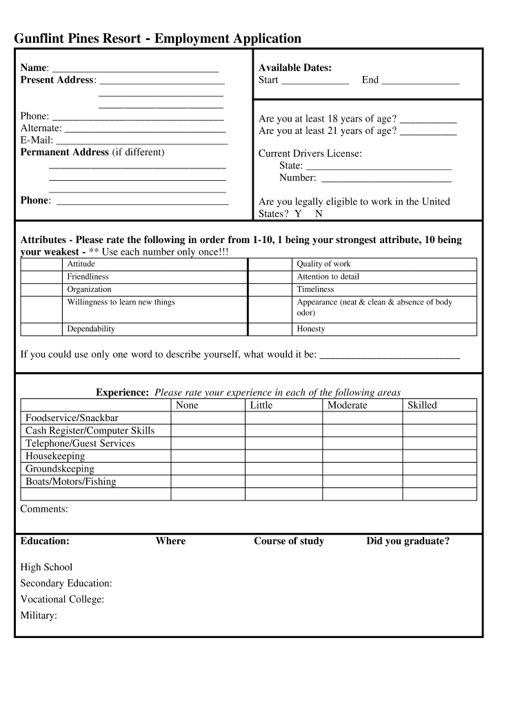 Gun flint Pines ResortEmployment Application Name: Present Address: Phone: Alternate: Email: Permanent Address(if different) Phone: Available Dates: Start End Are you at least 18 years of age? Are
