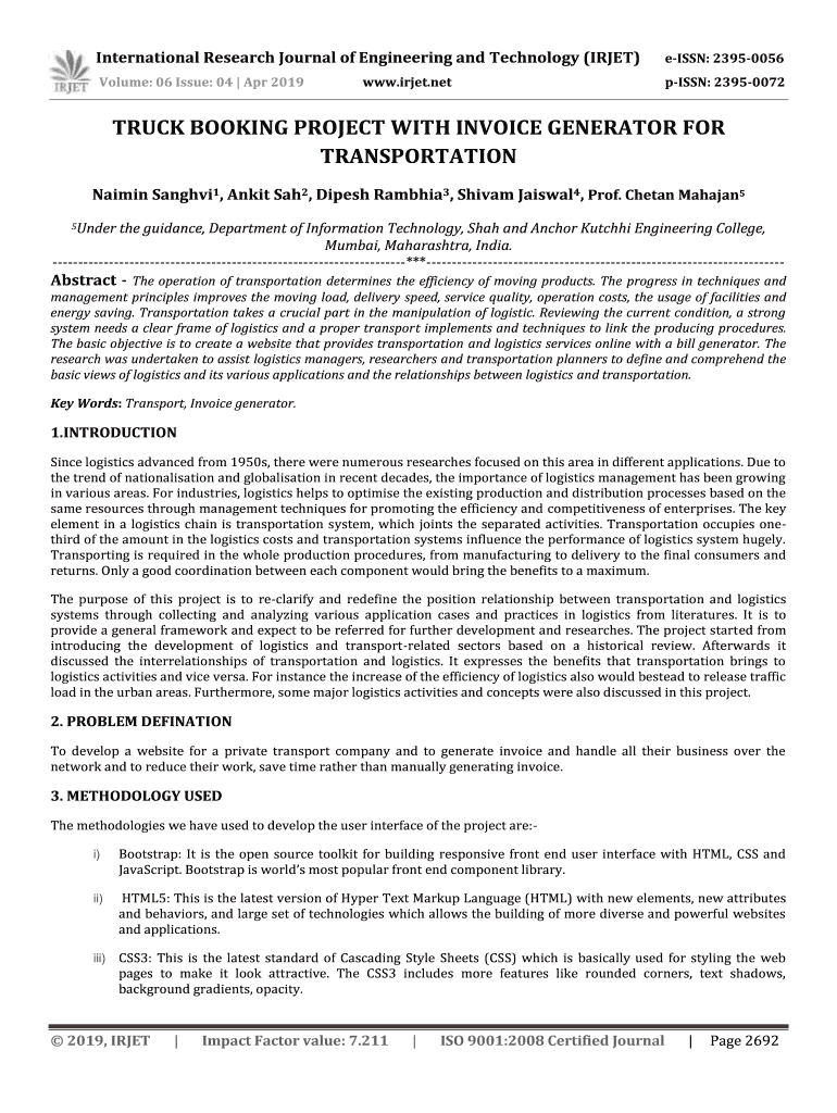 International Research Journal of Engineering and Technology (JET)ISSN: 23950056Volume: 06 Issue: 04 Apr 2019pISSN: 23950072www.jet.struck BOOKING PROJECT WITH INVOICE GENERATOR FOR TRANSPORTATION