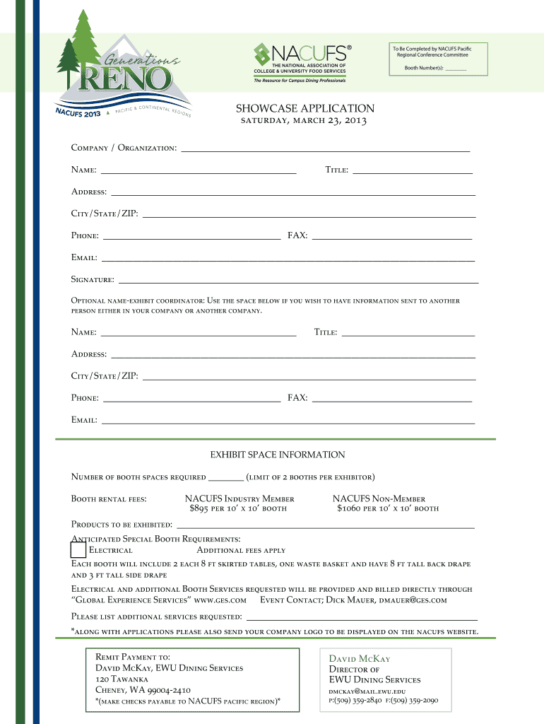 To Be Completed by NAC UFS Pacific Regional Conference Committee Booth Number(s): SHOWCASE APPLICATION Saturday, March 23, 2013, Company / Organization: Name: Title: Address: City/State/ZIP: Phone: