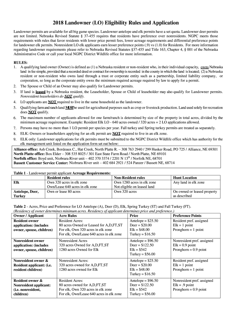 2018 Landowner (LO) Eligibility Rules and Application Landowner permits are available for all big game species. Landowner antelope and elk permits have a set quota. Landowner deer permits are not