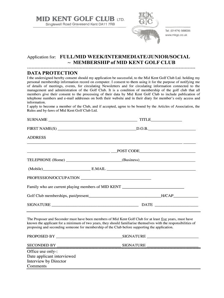 Application for: FULL/MID WEEK/INTERMEDIATE/JUNIOR/SOCIAL MEMBERSHIP of MID KENT GOLF CLUB