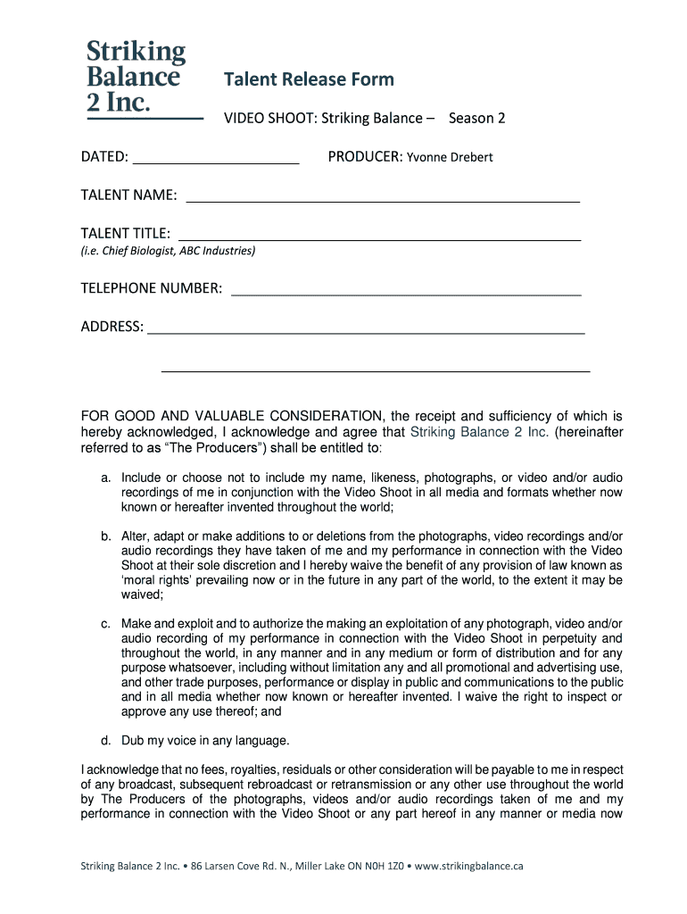 Talent Release Form VIDEO SHOOT: Striking Balance Season 2 DATED: PRODUCER: Yvonne DrebertTALENT NAME: TALENT TITLE: (i.e. Chief Biologist, ABC Industries)TELEPHONE NUMBER: ADDRESS: FOR GOOD AND VALUABLE