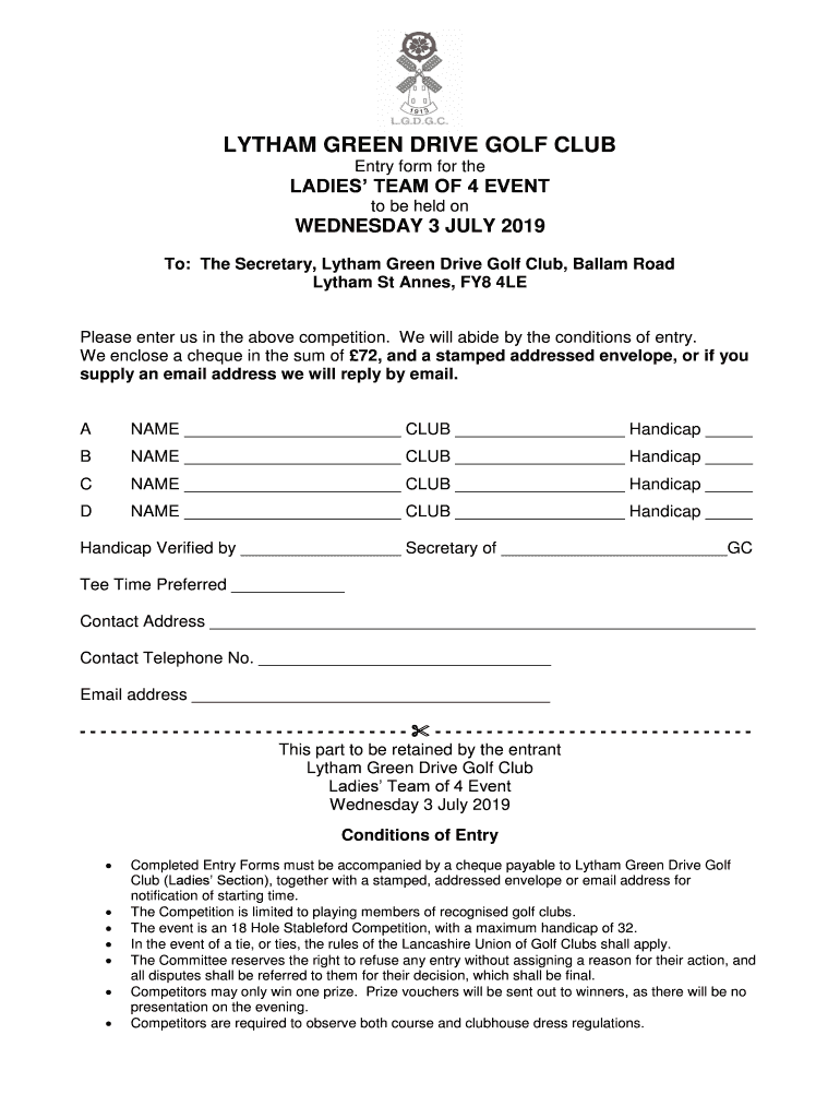 LATHAM GREEN DRIVE GOLF CLUB Entry form for therapies TEAM OF 4 EVENT to be held Wednesday 3 JULY 2019 To: The Secretary, Latham Green Drive Golf Club, Ballad Road Latham St Anne's, FY8 4LEPlease