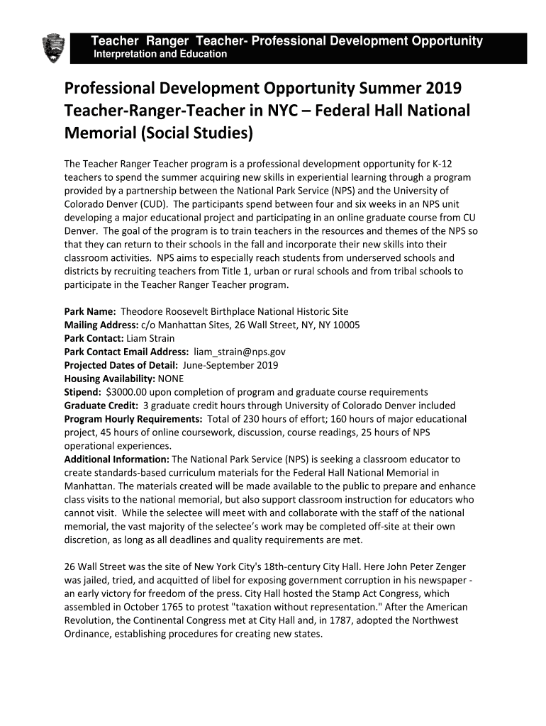 Teacher Ranger Teacher Professional Development Opportunity Interpretation and EducationProfessional Development Opportunity Summer 2019 TeacherRangerTeacher in NYC Federal Hall National Memorial