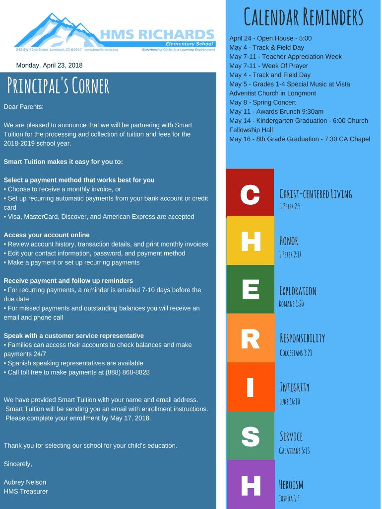 Calendar Reminders Monday, April 23, 2018Principal's Corner Dear Parents: We are pleased to announce that we will be partnering with Smart Tuition for the processing and collection of tuition and