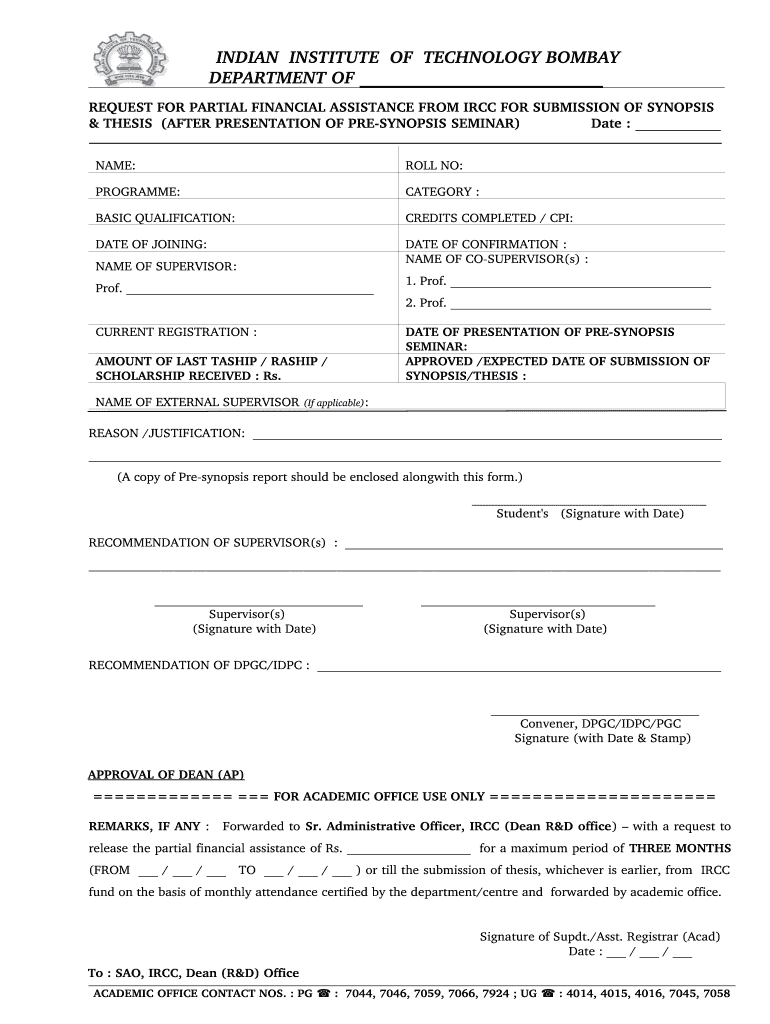 INDIANINSTITUTEOFTECHNOLOGYBOMBAY DEPARTMENT REQUESTFORPARTIALFINANCIALASSISTANCEFROMIRCCFORSUBMISSIONOFSYNOPSIS THESIS(AFTERPRESENTATIONOFPRESYNOPSISSEMINAR)Date: NAME:ROL LNO:Program:CATEGORY:BASICQUALIFICATION:CREDITSCOMPLETED/CPI:DATEOFJOINING:DATEOFCONFIRMATION:
