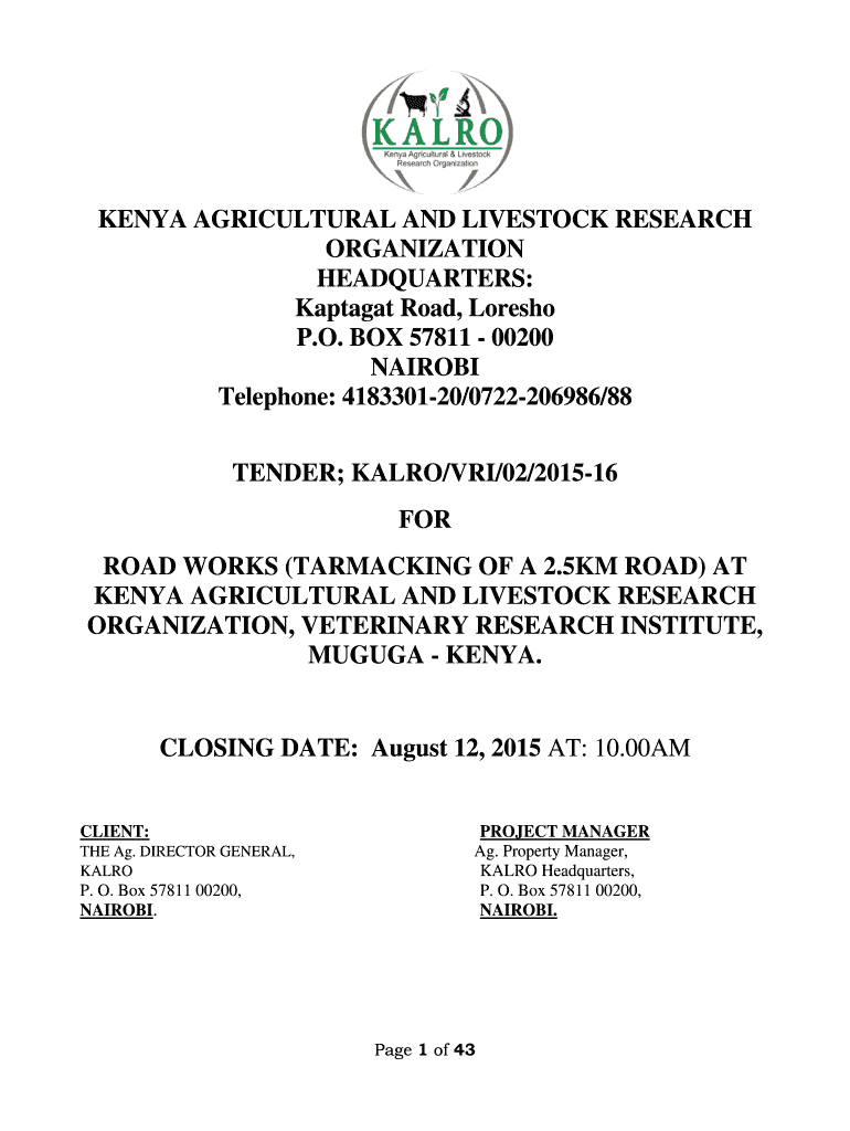 KENYA AGRICULTURAL AND LIVESTOCK RESEARCH ORGANIZATION HEADQUARTERS: BAPAAT Road, Lorenzo P.O. BOX 57811 00200 NAIROBI Telephone: 418330120/0722206986/88 TENDER; KARO/VRI/02/201516 FOR ROAD WORKS