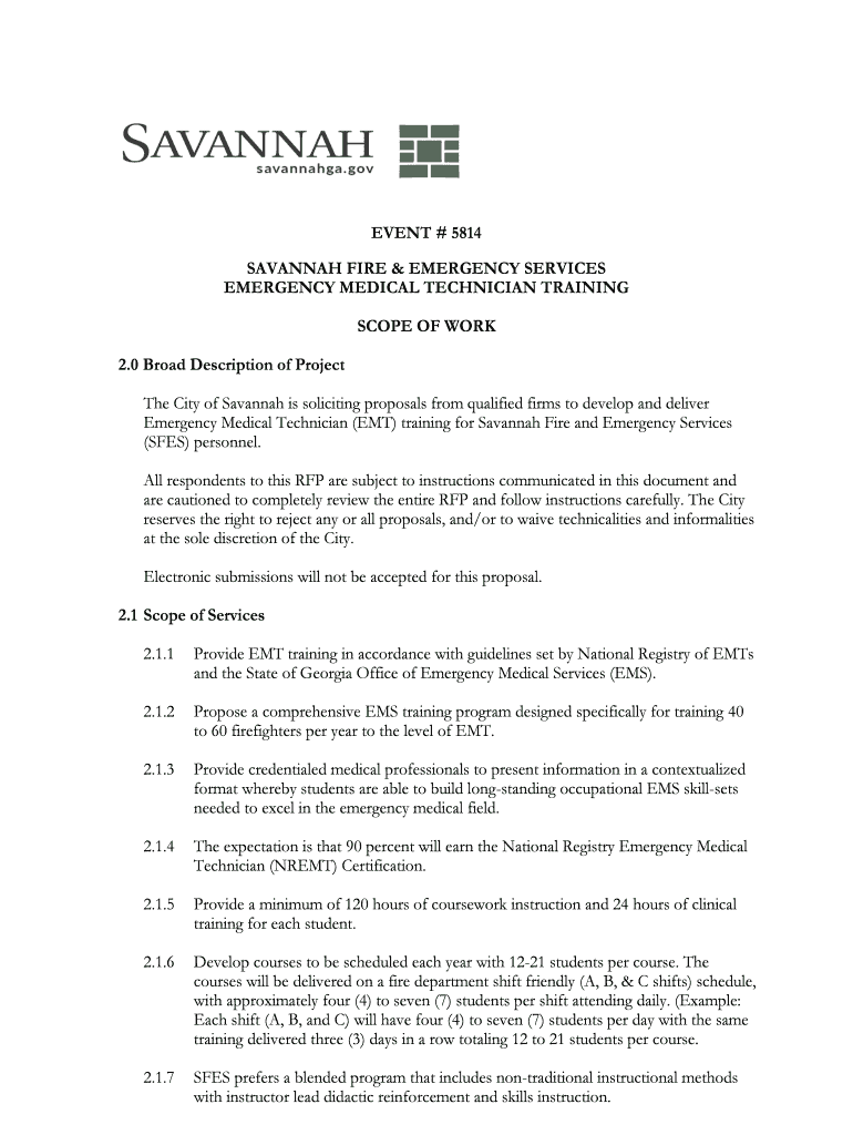 EVENT # 5814 SAVANNAH FIRE & EMERGENCY SERVICES EMERGENCY MEDICAL TECHNICIAN TRAINING SCOPE OF WORK 2.0 Broad Description of Project The City of Savannah is soliciting proposals from qualified firms