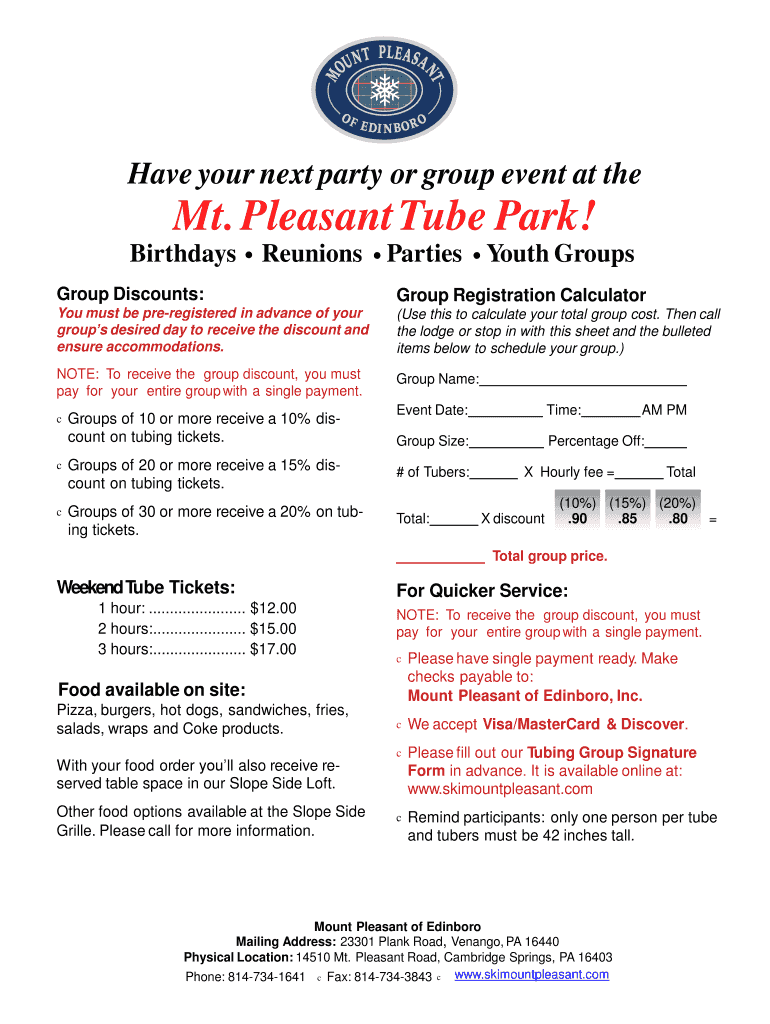 Have your next party or group event at them. Pleasant Tube Park! BirthdaysReunions Parties Youth GroupsGroup Discounts:Group Registration Calculator must be preregistered in advance of your groups