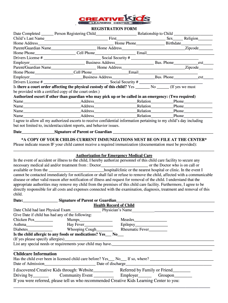 . REGISTRATION FORM Date Completed Person Registering Child Relationship to Child's Last Name First Sex Religion Home Address Home Phone Birthdate Parent/Guardian Name Home Address Zip code Home Phone