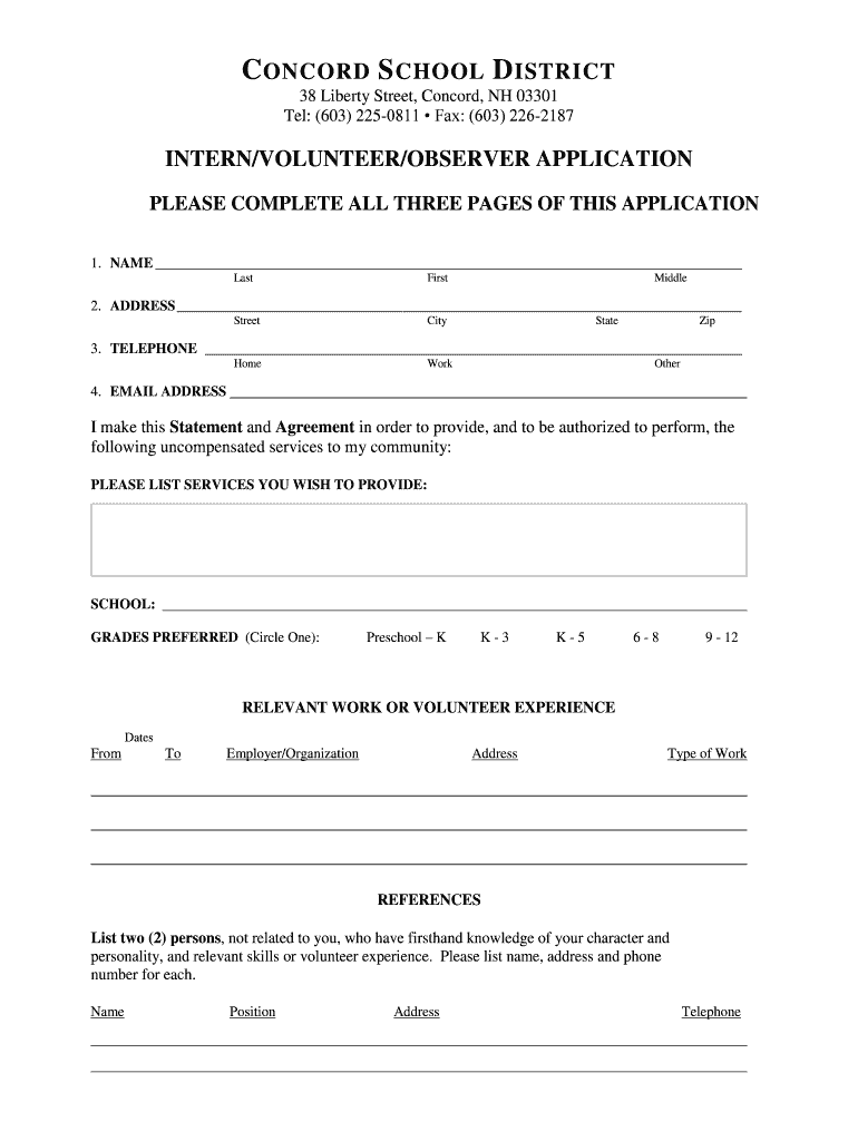 C CONCORD S SCHOOL DI STRICT 38 Liberty Street, Concord, NH 03301 Tel: (603) 2250811 Fax: (603) 2262187INTERN/VOLUNTEER/OBSERVER APPLICATION PLEASE COMPLETE ALL THREE PAGES OF THIS APPLICATION 1.