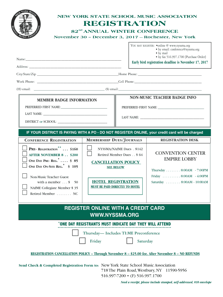 NEW YORK STATE SCHOOL MUSIC ASSOCIATION82ndREGISTRATIONANNUAL WINTER CONFERENCE November 30 December 3, 2017Rochester, New Tokyo MAY REGISTER: online www.nyssma.org by email: conference Nyasa.org