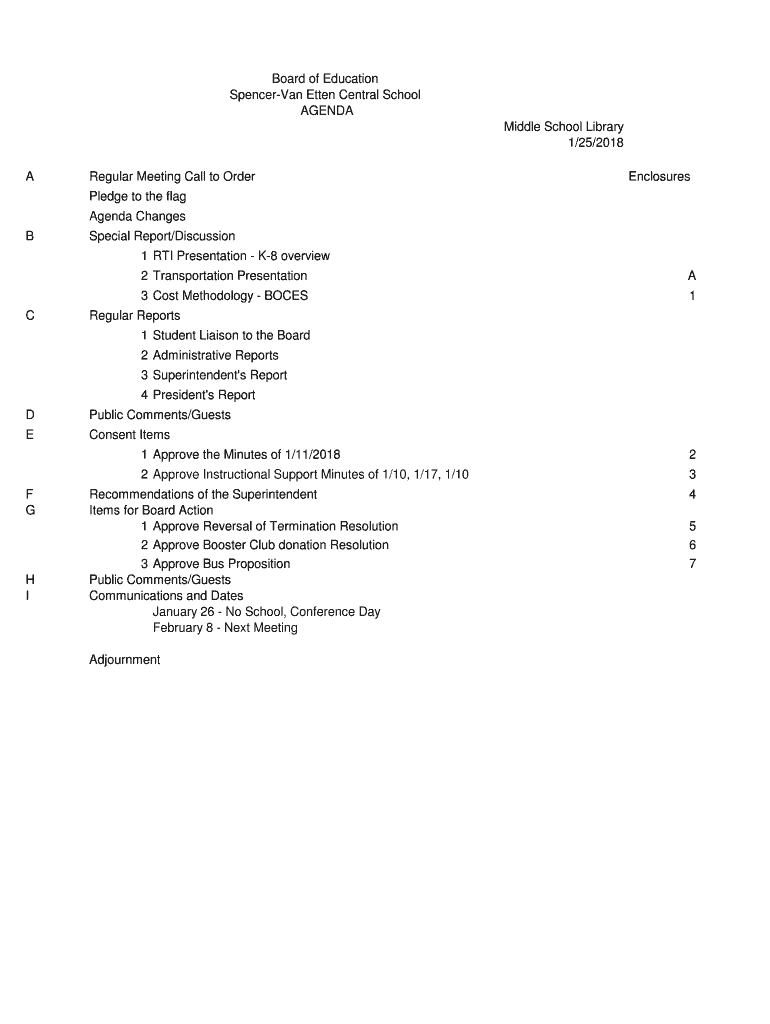Board of Education Spencerian Eaten Central School AGENDA Middle School Library 1/25/2018 Regular Meeting Call to OrderEnclosuresPledge to the flag Agenda Changes Special Report/Discussion 1 RTI Presentation