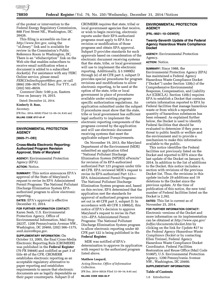 78850Federal Register / Vol. 79, No. 250 / Wednesday, December 31, 2014 / Notices of the protest or intervention to the