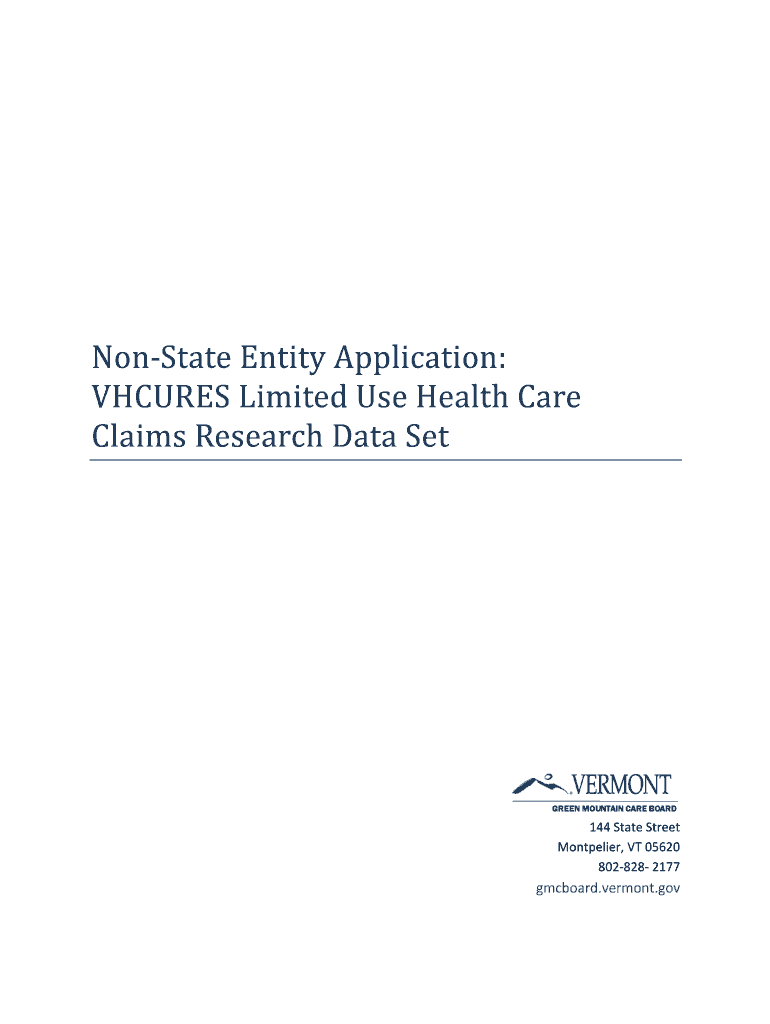 Onstage×Entity×Application:CURES×Limited×Use×Health×Reclaims×Research×Data×Set144×State×Street Montpelier, ×VT 05620802828×2177gmcboard. Vermont.govNonState×Entity×Application: CURES×Limited×Use×Health×Care×Claims×Research×Data×Reapplication
