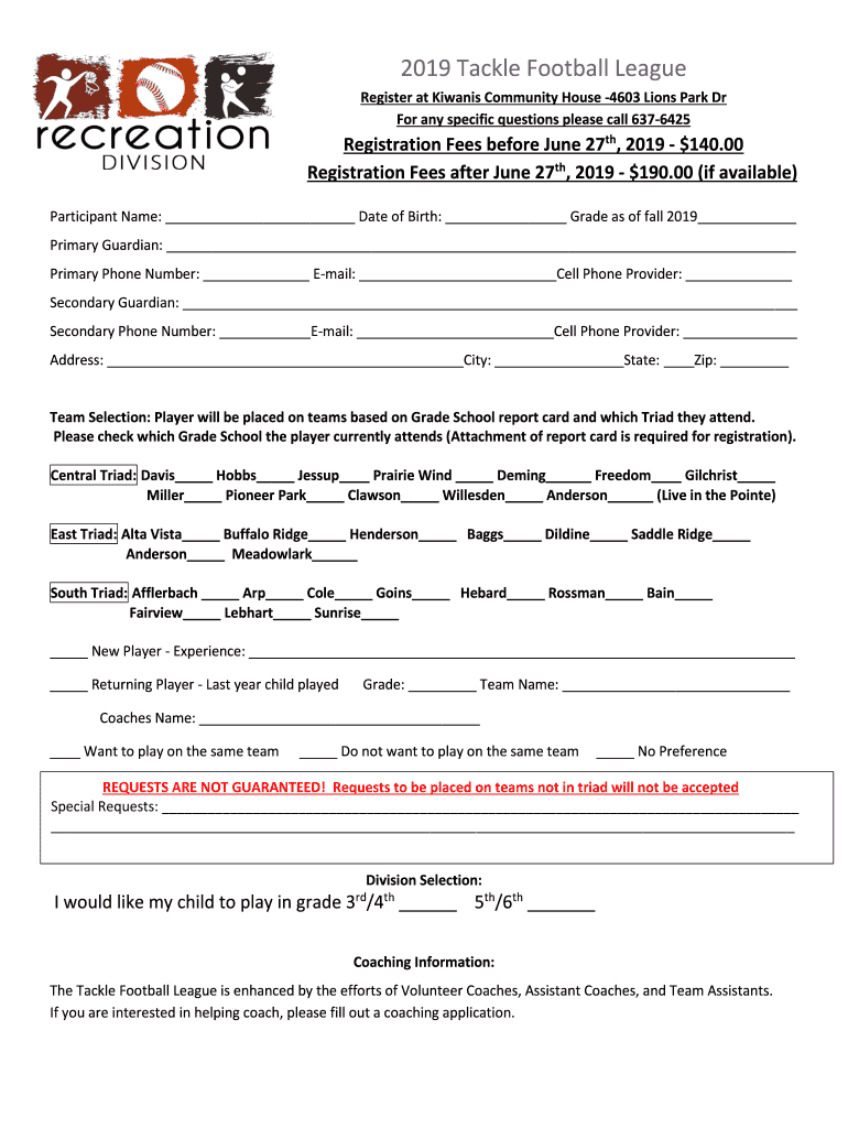 2019 Tackle Football League Register at Kiwanis Community House 4603 Lions Park Dr For any specific questions please call 6376425Registration Fees before June 27th, 2019 ×140.00 Registration Fees