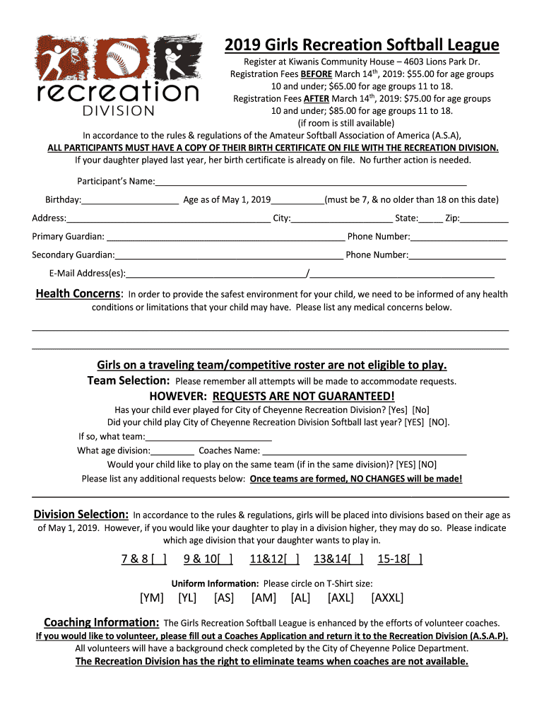 2019 Girls Recreation Softball League Register at Kiwanis Community House 4603 Lions Park Dr. Registration Fees BEFORE March 14th, 2019: $55.00 for age groups 10 and under; $65.00 for age groups 11