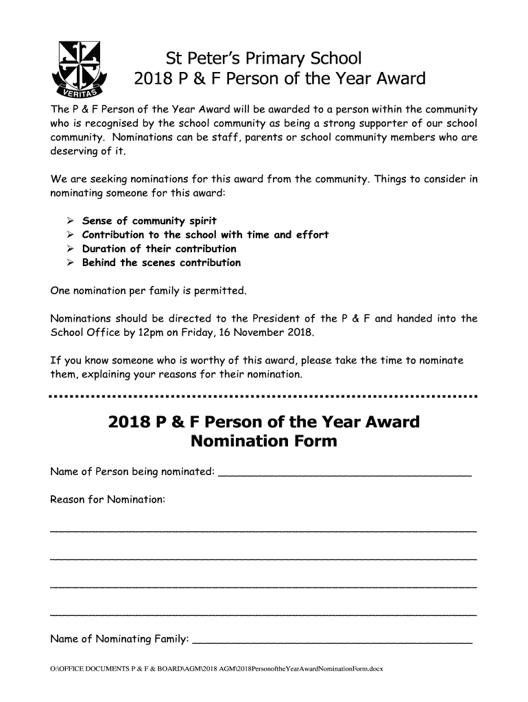 St Peters Primary School 2018 P & F Person of the Year Award The P & F Person of the Year Award will be awarded to a person within the community who is recognized by the school community as being