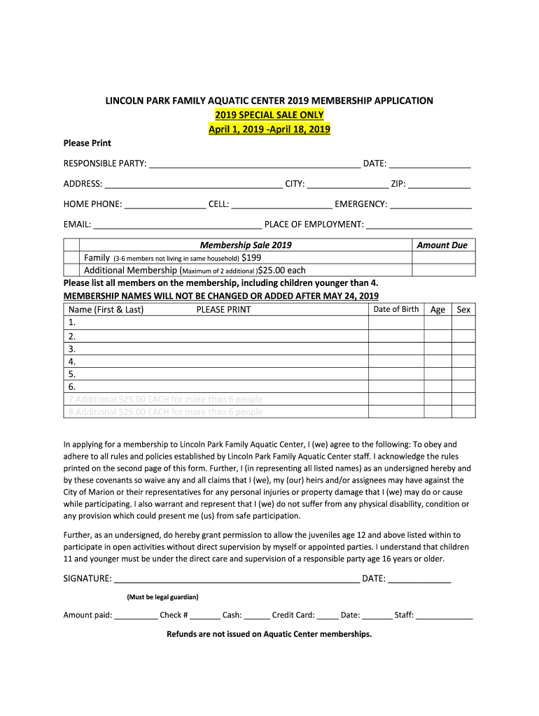 LINCOLN PARK FAMILY AQUATIC CENTER 2019 MEMBERSHIP APPLICATION 2019 SPECIAL SALE ONLY April 1, 2019, April 18, 2019, Please Print RESPONSIBLE PARTY: DATE: ADDRESS: CITY: ZIP: HOME PHONE: CELL: EMERGENCY: