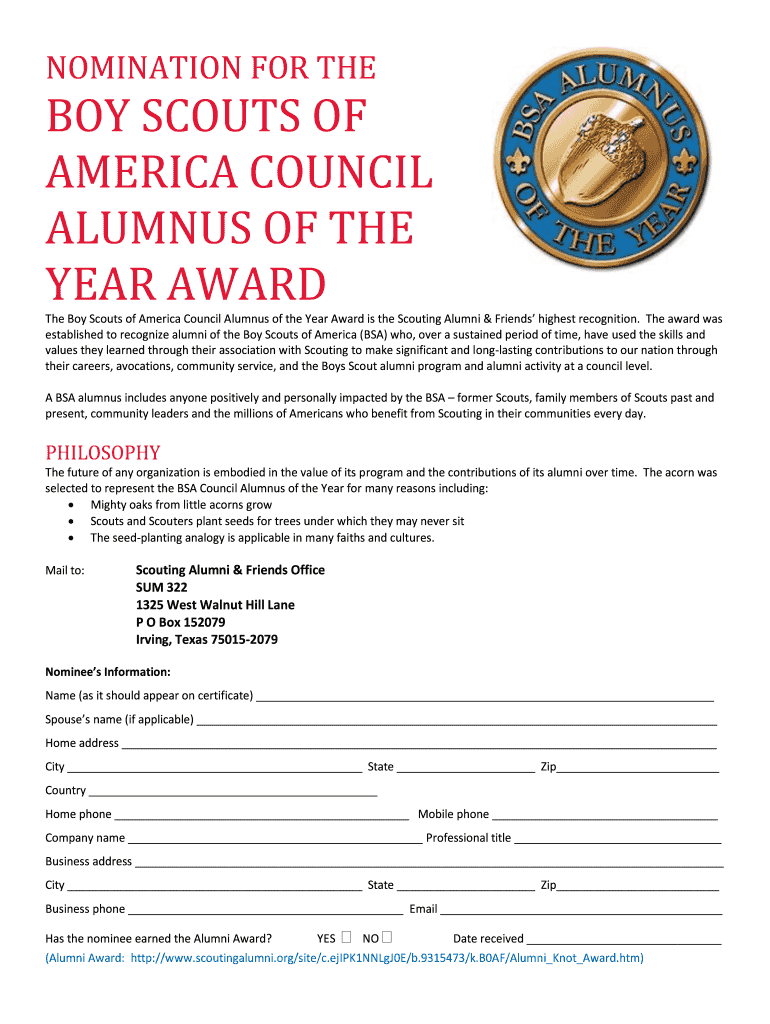 Get the free NOMINATION FOR THE BOY SCOUTS OF AMERICA COUNCIL ALUMNUS OF ...
