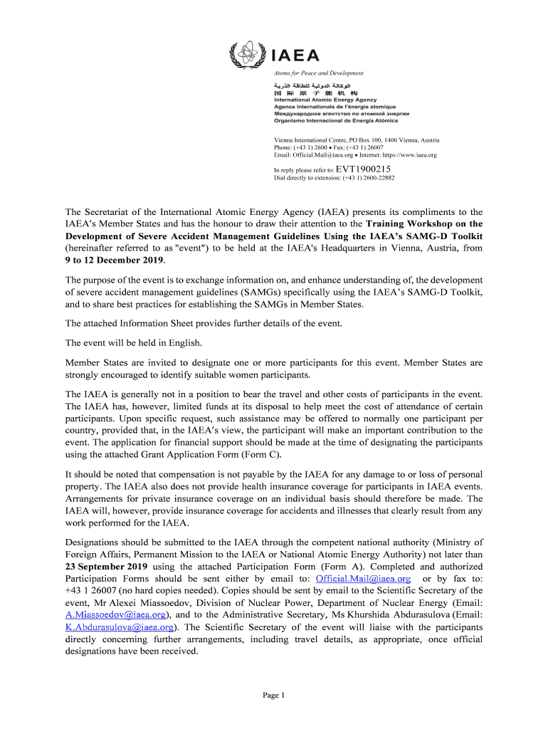 Atoms for Peace and Development Vienna International Center, PO Box 100, 1400 Vienna, Austria Phone: (+43 1) 2600 Fax: (+43 1) 26007 Email: Official. Mail idea.org Internet: https://www.iaea.org In