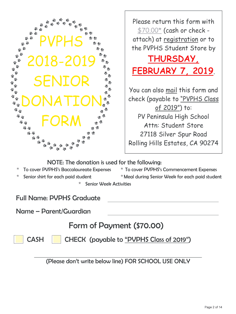 20182019 SENIOR INFORMATION Tables OF CONTENTS 2. . . . . . . . PV PHS 20182019 Senior Donation 3. . . . . . . . Senior Off Campus Pass Form 47. . . . . . Her ff Jones Graduation Information 89. .