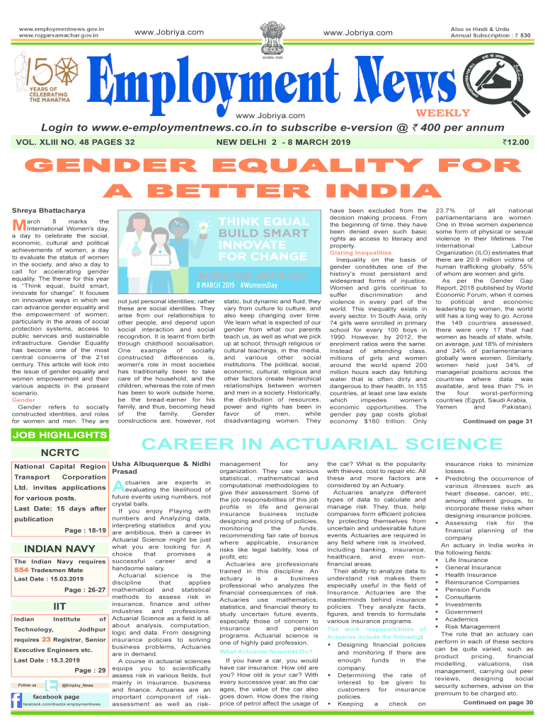 WWW. Oriya.come. Oriya.come. Oriya.common to www.eemploymentnews.co.in to subscribe version 400 per annum VOL. XIII NO. 48 PAGES 32NEW DELHI 2 8 MARCH 2019 12.00GENDER EQUALITY FOR A BETTER INDIA