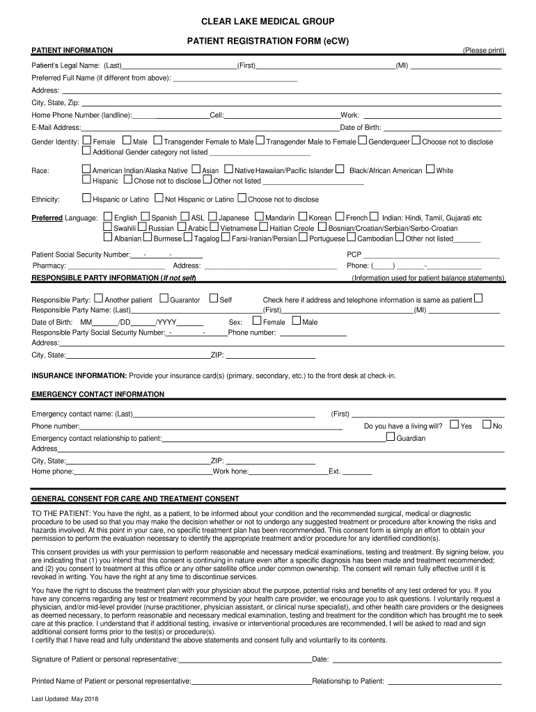 CLEAR LAKE MEDICAL GROUP PATIENT REGISTRATION FORM (ECW) PATIENT INFORMATION(Please print)Patients Legal Name: (Last)(First)(MI)Preferred Full Name (if different from above): Address: City, State,