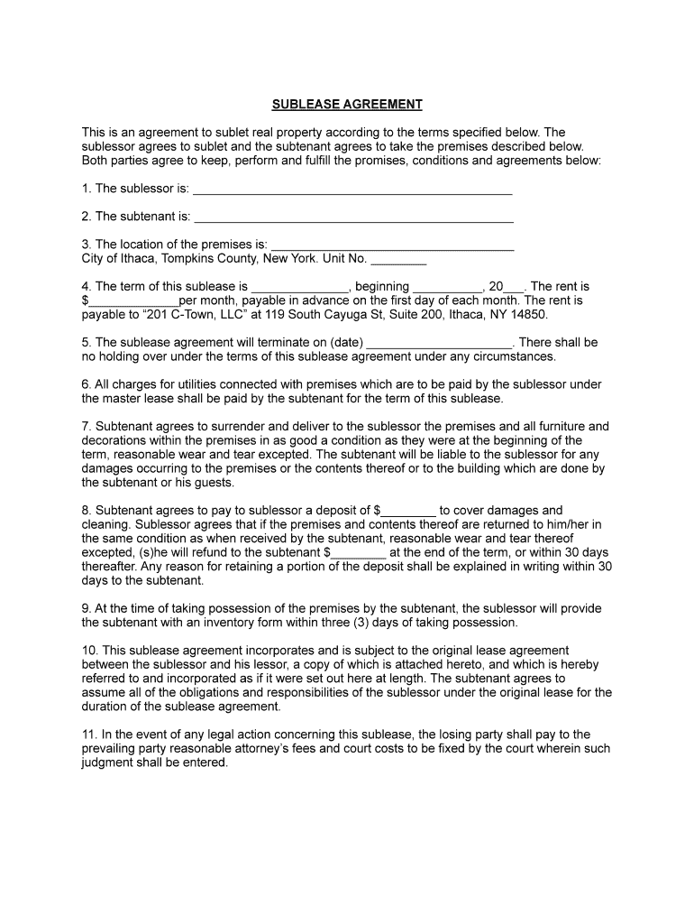 SUBLEASE AGREEMENT This is an agreement to sublet real property according to the terms specified below. The sublessor agrees to sublet and the subtenant agrees to take the premises described below.