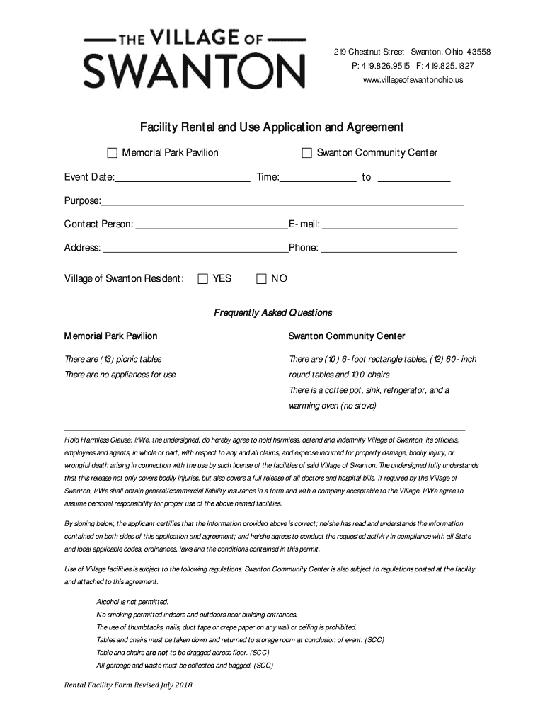 219 Chestnut Street Swanton, Ohio 43558 P: 419.826.9515 F: 419.825.1827 www.villageofswantonohio.usFacility Rental and Use Application and Agreement Memorial Park Pavilion Swanton Community CenterEvent