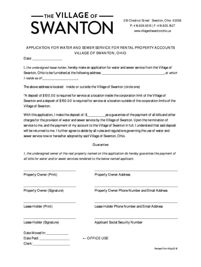 219 Chestnut Street Swanton, Ohio 43558 P: 419.826.9515 F: 419.825.1827 www.villageofswantonohio.usAPPLICATION FOR WATER AND SEWER SERVICE FOR RENTAL PROPERTY ACCOUNTS VILLAGE OF SWANTON, OHIO Date: