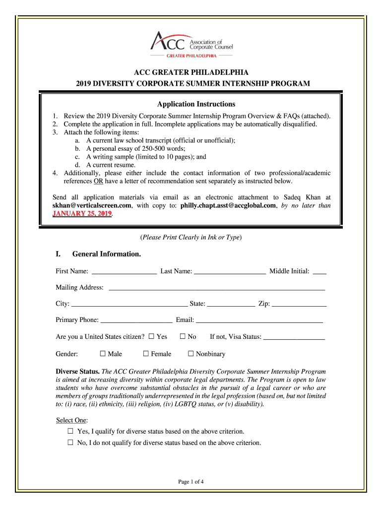 ACC GREATER PHILADELPHIA 2019 DIVERSITY CORPORATE SUMMER INTERNSHIP PROGRAM Application Instructions 1. Review the 2019 Diversity Corporate Summer Internship Program Overview & FAQs (attached). 2.