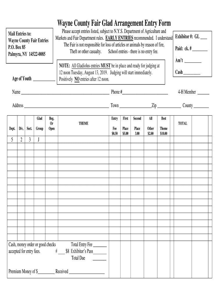 Wayne County Fair Glad Arrangement Entry Form Please accept entries listed, subject to N.Y.S. Department of Agriculture and Markets and Fair Department rules. EARLY ENTRIES recommended. I understand