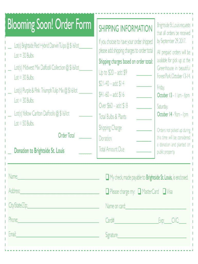 Blooming Soon! Order Form Lot(s) Bright side Red Hybrid Darwin Tulips $16/lot 30 Bulbs Lot(s) Midwest Mix Daffodil Collection $16/lot 30 Bulbs Lot(s) Purple & Pink Triumph Tulip Mix $16/lot 30 Bulbs