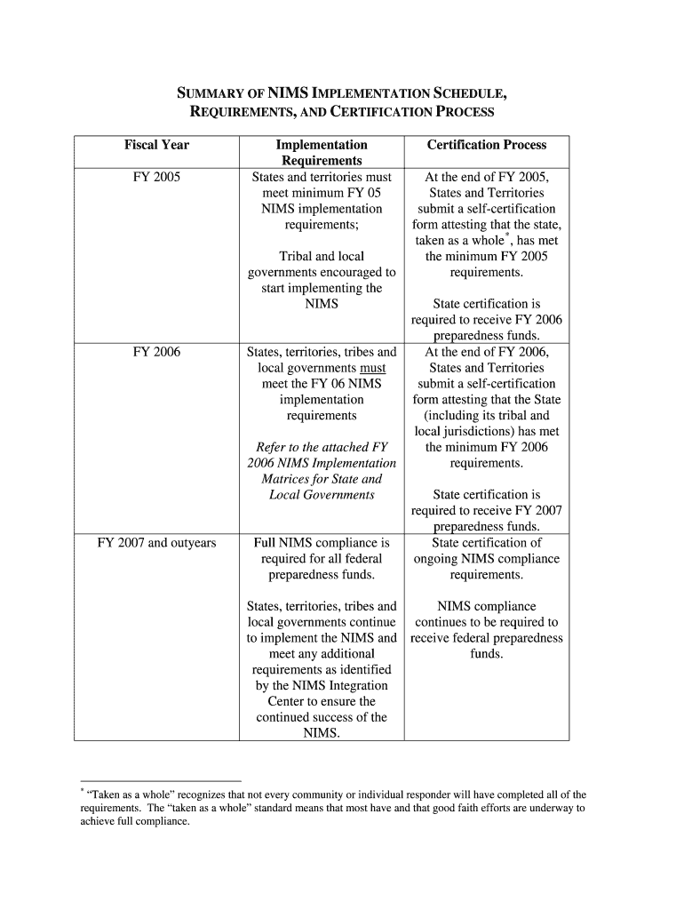 Get the free SUMMARY OF NIMS IMPLEMENTATION SCHEDULE , - fema